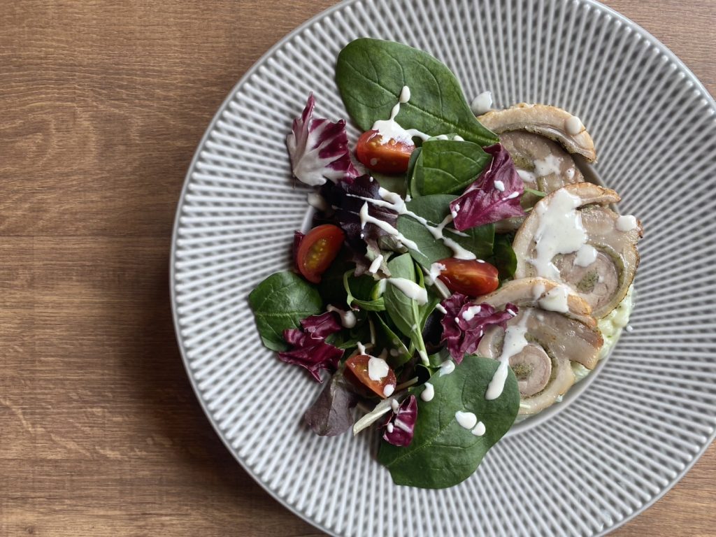 『道産豚肉のポルケッタ、バジルクリームのリゾット~サラダ仕立て~』