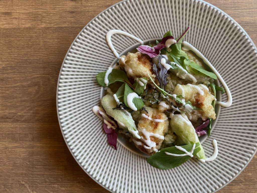 鶏肉、旬のアスパラのフリットはジューシーで軽い仕上がりに