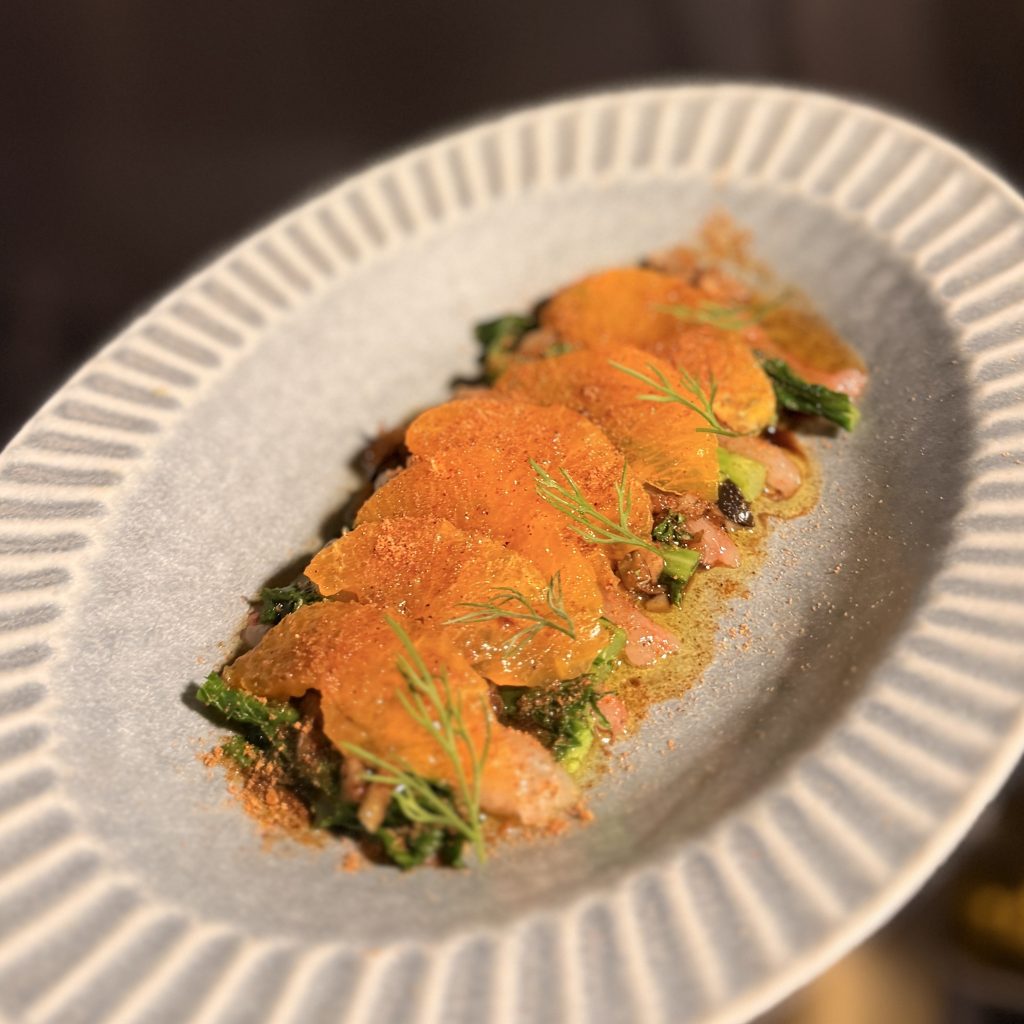 「甘エビのカルパッチョ〜菜花とデコポン〜」