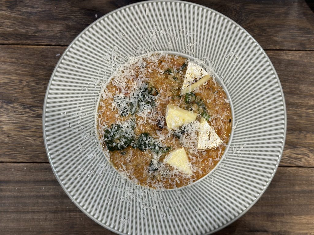 『 甘エビのラグーとちぢみほうれん草・カマンベールチーズのトマトクリームリゾット 』