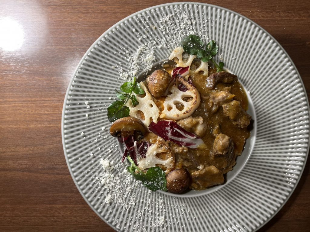 『ビーフシチューと蓮根、きのこのボロネーゼリゾット』