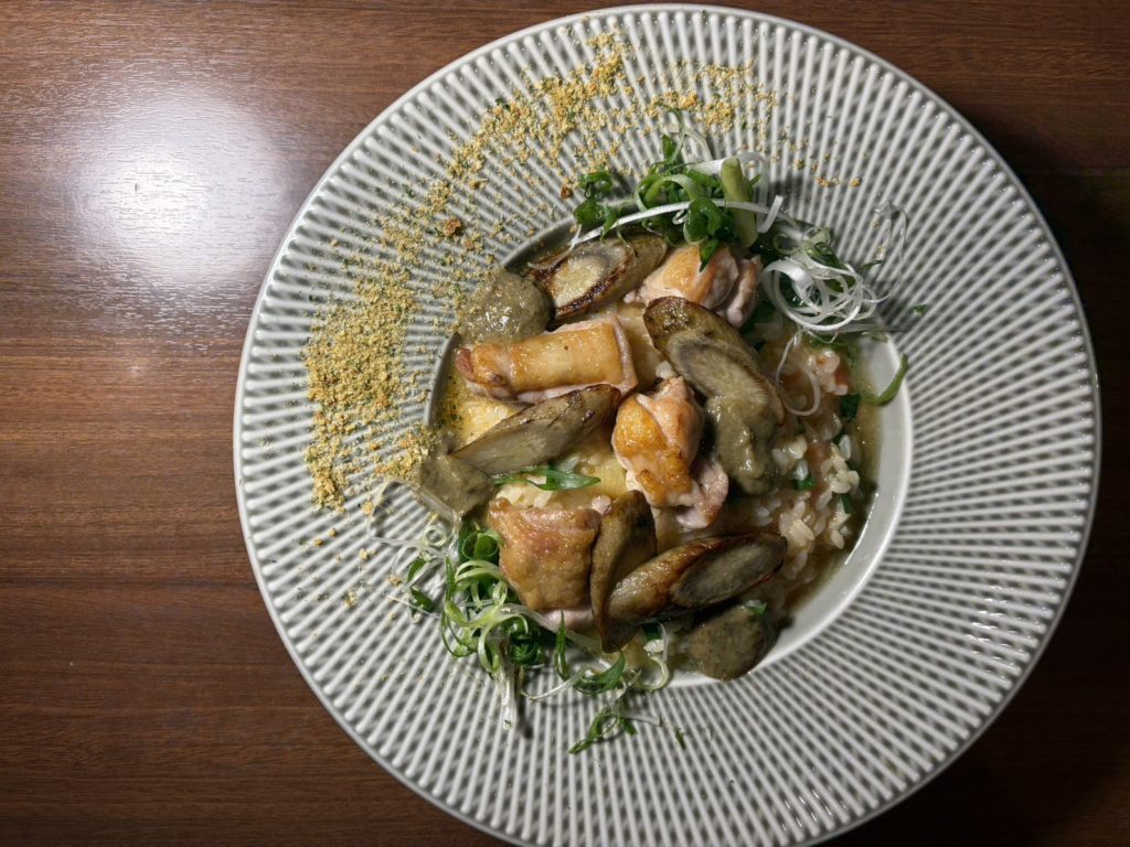 『鶏肉とごぼうのヴァポーレ、ふき味噌とニラのリゾット』